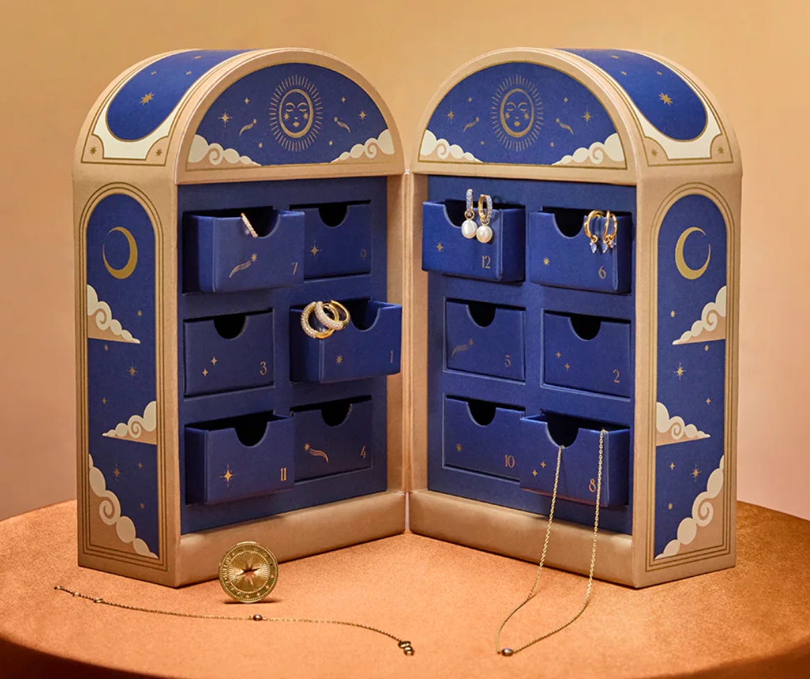 The Astrid and Miyu jewellery calendar in gold or silver at £345.